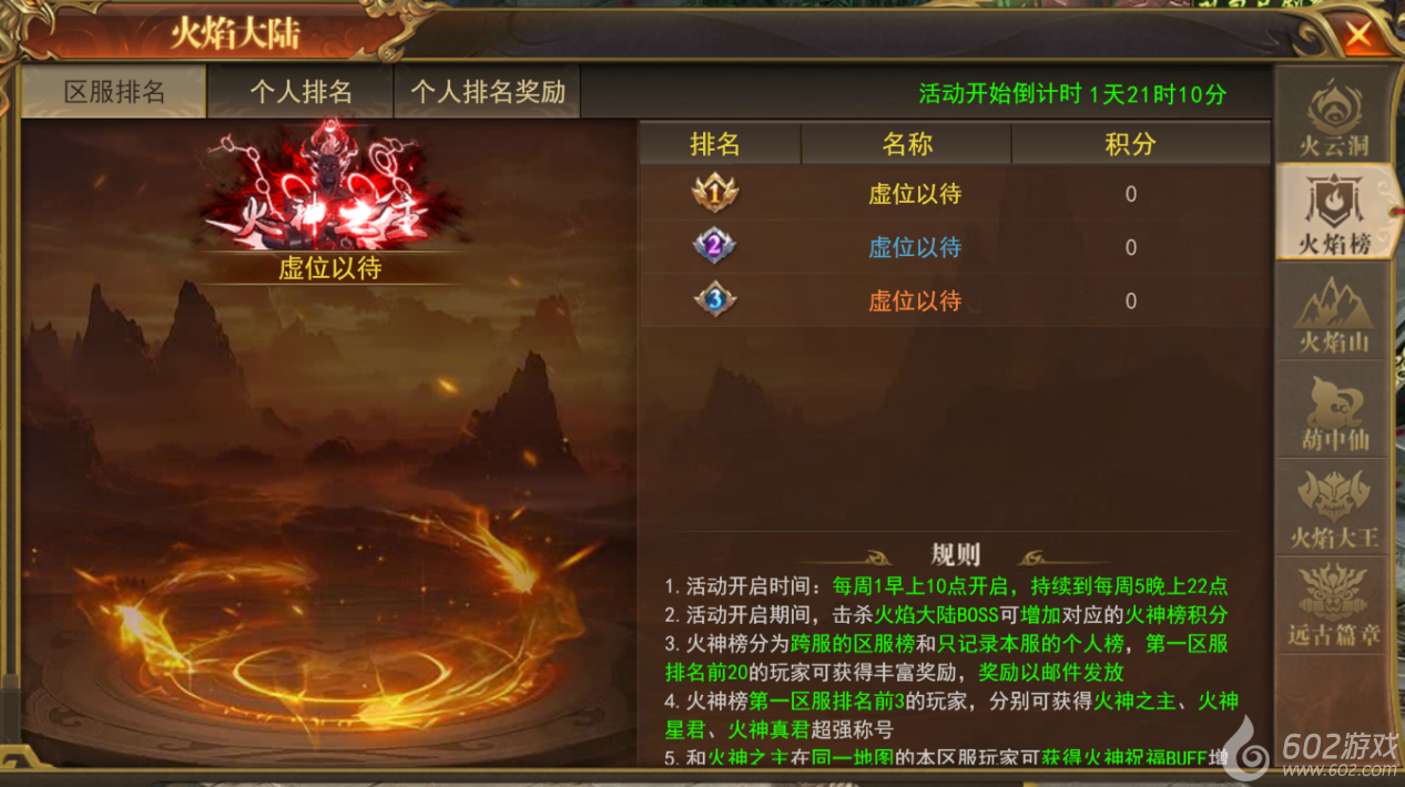 活动期间击杀火焰大陆boss可获得火焰积分,根据积分进行排名,榜单分区服排行和个人排行