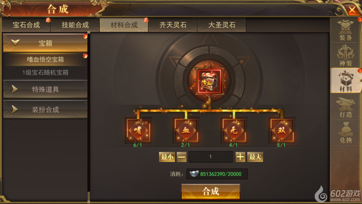 4、新增字帖合成系统,开服第7天开始掉落,合成可获得嗜血无双宝箱,开启宝箱有机会获得嗜血悟空装备