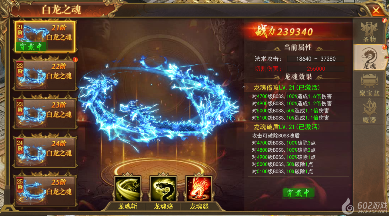1、新增白龙魂技能效果龙魂殇、龙魂怒技能,新增对无盾怪物的倍功伤害效果