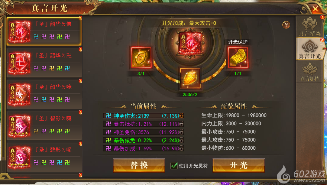 真言开光--可使用佛门开光石对真言进行开光,每件有5个属性槽位可使用开光石进行解锁,
