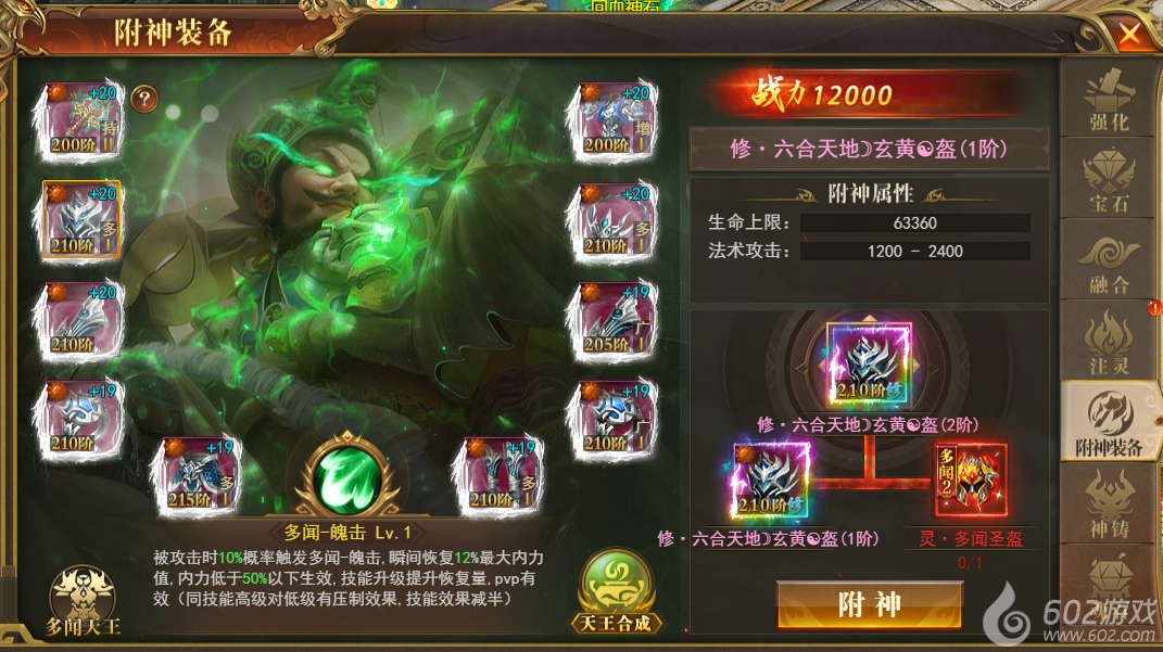 附神装备分为四大天王圣装,可分别与角色身上主装备附神,可获得大量属性更有天王套装属性加成和套装技能