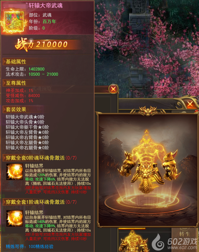 2、新增百万年魂环,穿戴一套十万年魂环魂骨可解锁。魂环分为:轩辕大帝武魂、盘古大帝武魂,佩戴全套可激活超强结界效果