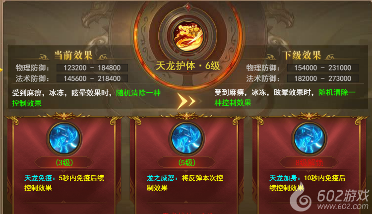 被动神技:天龙护体--受到麻痹、冰冻、眩晕效果时,随机清除一种负面效果,技能提升到3、5、8级还可以激活特殊效果
