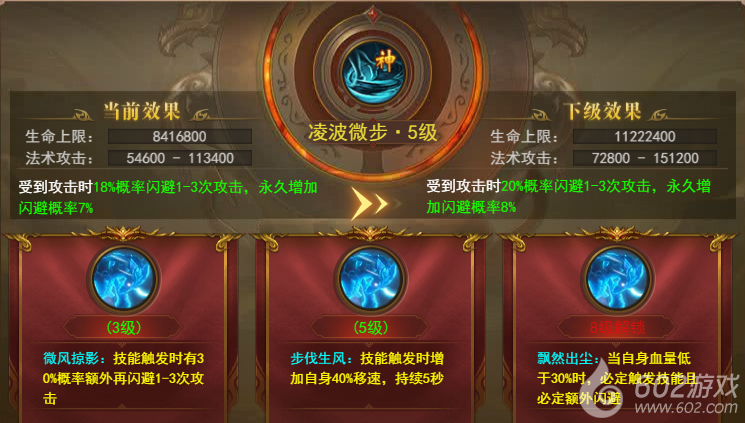 被动神技:凌波微步--受到攻击时概率闪避1-3次攻击,永久增加闪避概率,技能提升到3、5、8级还可以激活特殊效果