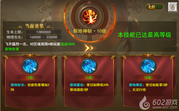 战士神技:裂地神斩--飞身猛烈一击,对区域周围四格玩家造成裂地伤害,技能提升到3、5、8级还可以激活特殊效果