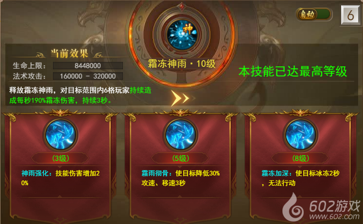 法师神技:霜冻神雨--对目标范围6格玩家持续造成霜冻伤害打击,技能提升到3、5、8级还可以激活特殊效果