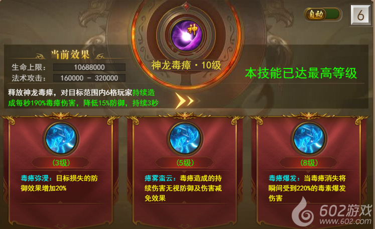 道士神技:神龙毒瘴-- 释放神龙毒瘴,对目标范围内6格玩家持续造成毒瘴伤害,并降低防御,技能提升到3、5、8级还可以激活特殊效果