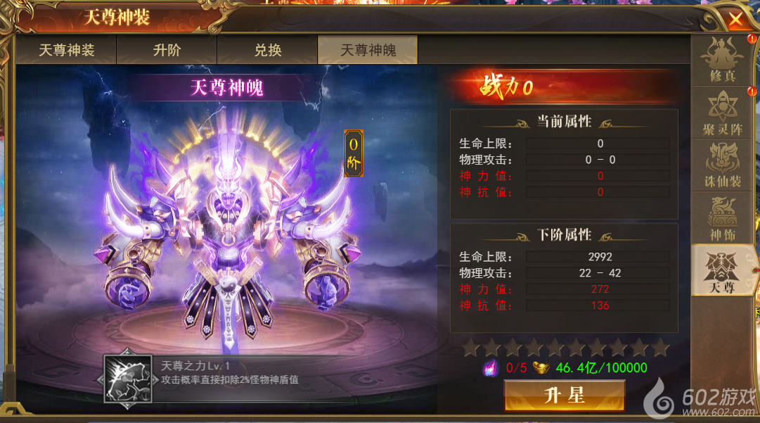 新增天尊神魄系统,升阶神魄可提升天尊之力等级,天尊之力:攻击时概率扣除怪物一定比例神盾值。