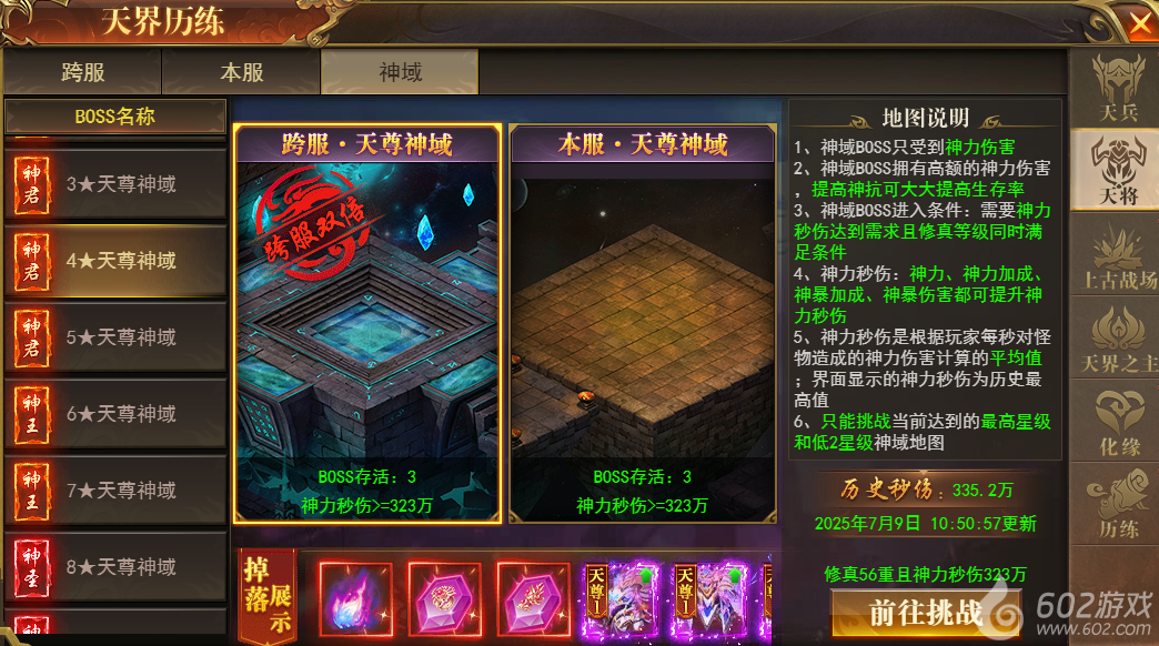 新增天界神域副本,可获取天界神装合成材料、天界神魄升级材料,神域BOSS只受神力伤害,需达到神力秒伤和修真等级条件才能进入,仅可挑战当前最高星级和低2星级地图。