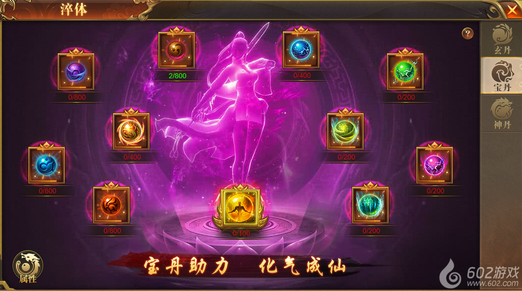 宝丹淬体,化气成仙。使用丹药(炼丹玩法产出)淬炼灵体,可提升角色各项属性。