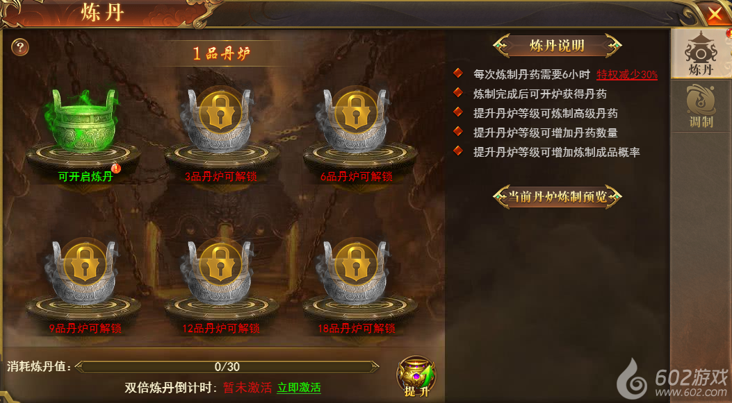 每次炼制丹药需要消耗一定时间(可消耗钻石加速),随丹炉品级提升最高可开启6个丹炉同时炼制。