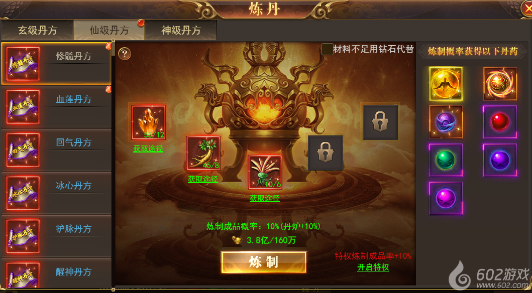 炼丹:点击丹炉可选择丹方进行炼丹(需要获取对应丹方并激活),概率炼制出对应丹方丹药,部分丹方需要丹炉达到对应品级才可炼制。
