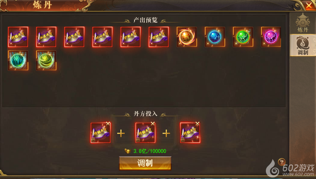 丹方调制:多余丹方可进行调制,概率获得其他丹方或成品丹药。