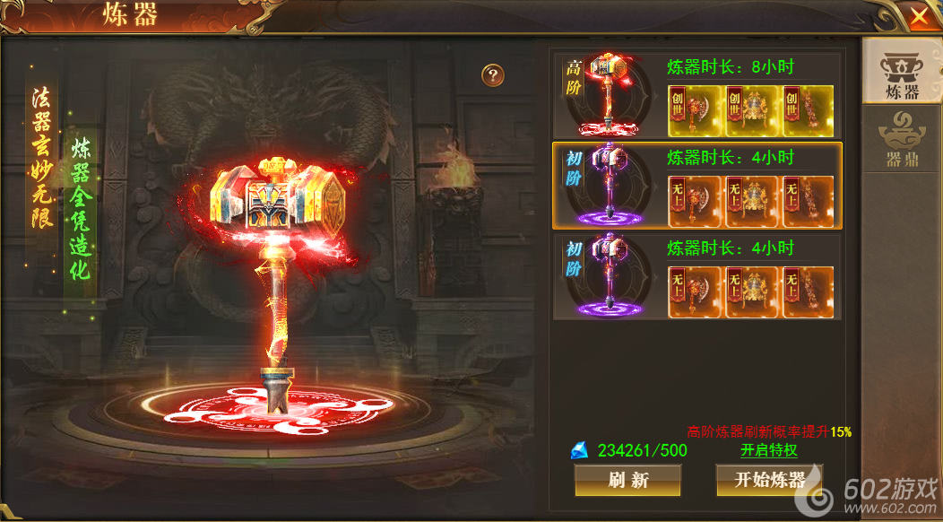 每次炼器完成可免费刷新一次炼器级别(可消耗钻石刷新)。