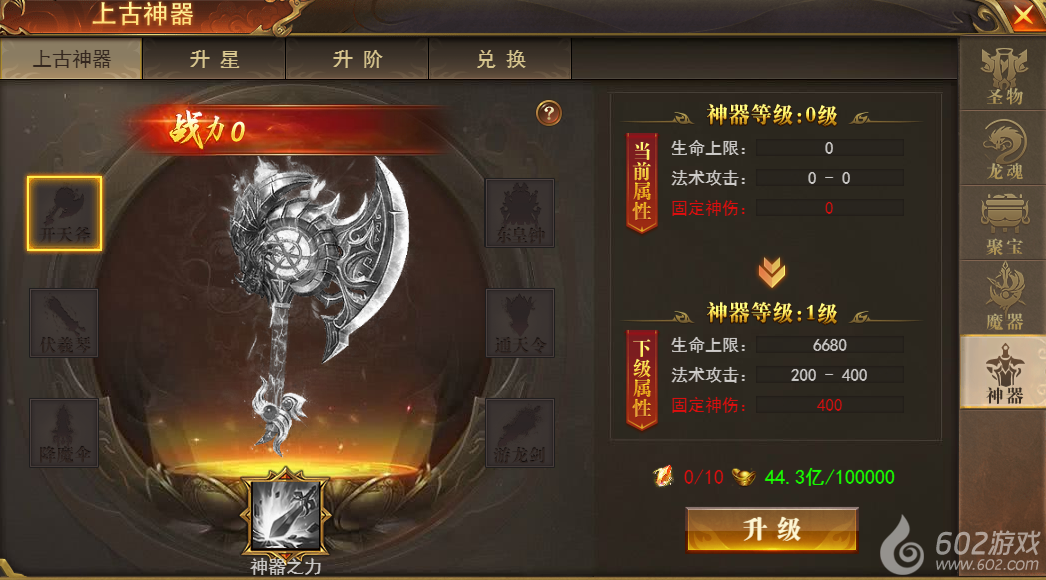 消耗上古神石(洞府炼器产出)提升神器等级可获得基础属性;