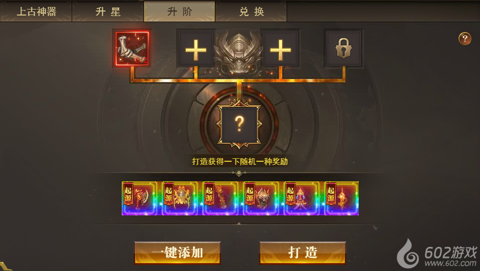 神器升阶:创世品质(3阶神器)上古神器+悟道佛骨可升阶为随机一件起源装备(4阶神器)。