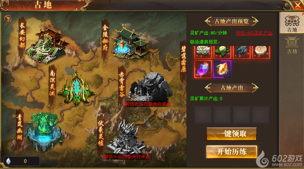 前往古地历练可获得道具和大量灵矿,灵矿可用于在古坊中购买稀有道具;