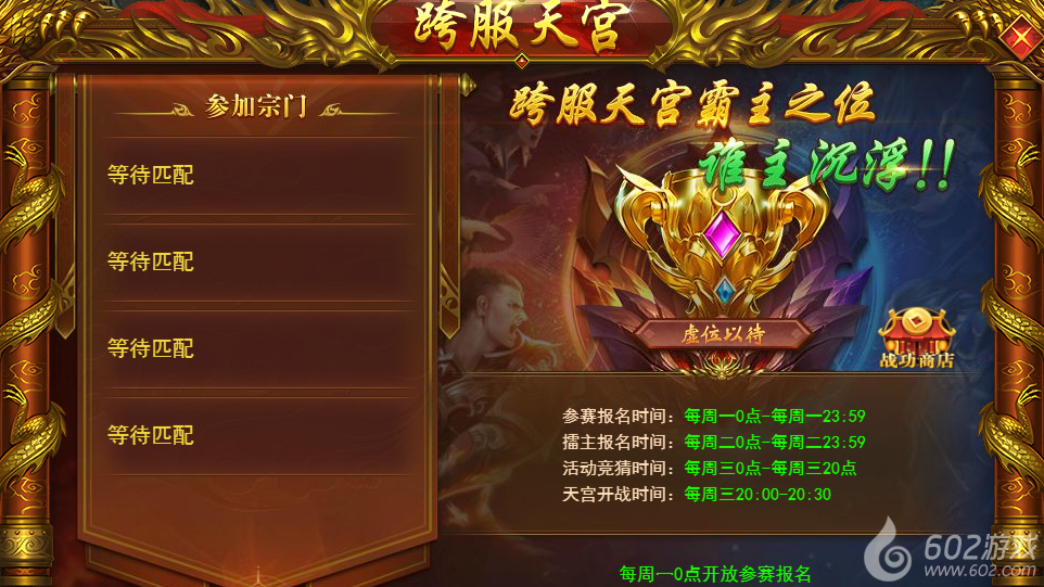 活动时间:每周一开放参赛报名(仅宗主或副宗主可报名),每周二开放擂主报名,每周三20:00-20:30跨服天宫开战,周三20:00点原【蟠桃盛宴】活动替换为【跨服天宫】。