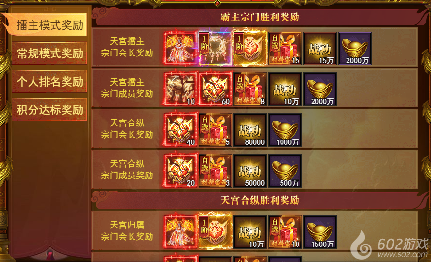 1、活动结束之后,根据本次天宫竞技模式及天宫归属发放宗门奖励(天宫之主时装、紫金铃、跨服天宫勋章、战功等);