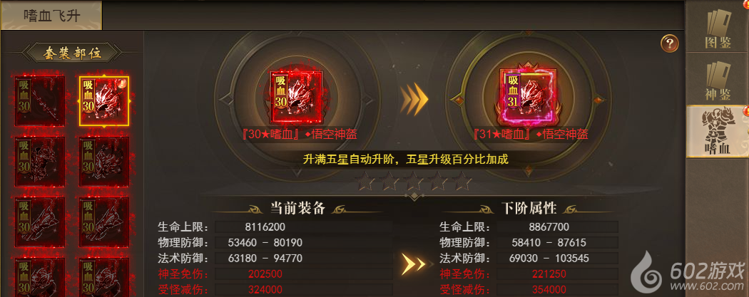 嗜血飞升为嗜血神装等阶拓展系统,每升五星自动升阶,获取大量属性!