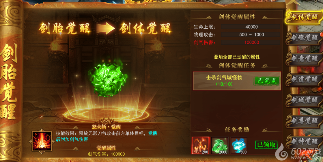 剑胎觉醒是凌霄剑域的特色系统,完成觉醒任务可完成技能觉醒,使技能附加剑气伤害效果!