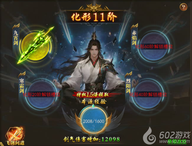 剑气本源会先存储进本源经验瓶里,存储有上限,需及时领取,领取的剑气本源会进入化形等级进度条,满进度条可自动升级;