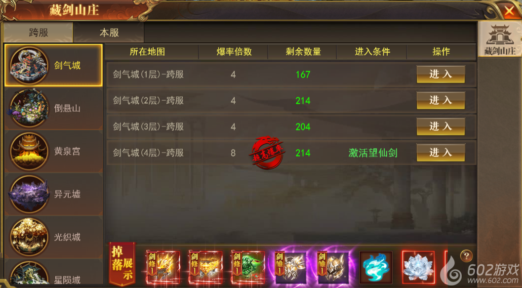跨服副本地图,共12层,不同层数所需剑胎等级不同,层数越高,奖励越好;